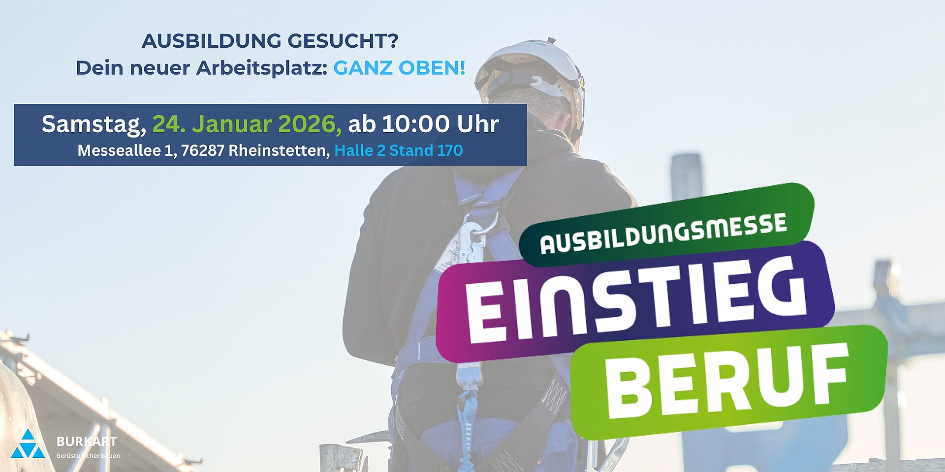 Dann besuche uns auf der Ausbildungsmesse Einstieg Beruf 2026 und entdecke die spannende und technisch anspruchsvolle Ausbildung zum Gerüstbauer (m/w/d).